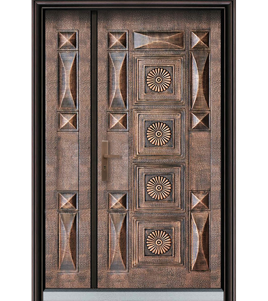 屋外面--日月星辰鑄鋁門板,金屬烤漆質感加上手刷金漆,沉穩內斂的氣勢襯托您入戶門面;象徵穩重的一家之主,支撐起一個家的安定感。 屋內面--胡桃木斜口實木板,斜口設計的刨溝實木面板變化型,百搭各式室內裝潢;如同溫婉賢淑的女主人,用心打點居家的體面。